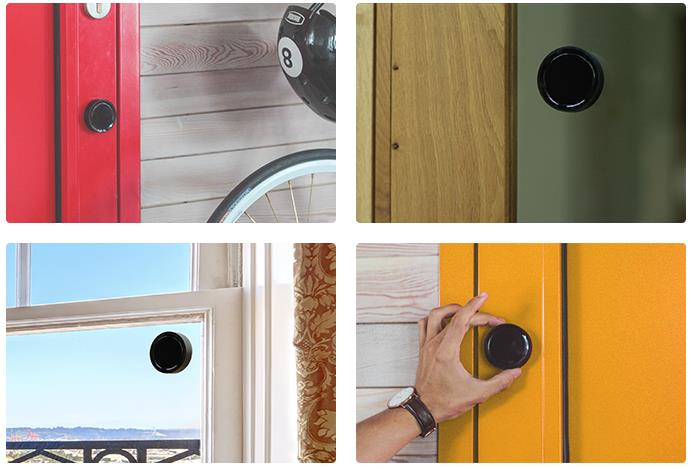 設置は簡単です。箱から出して、スマートフォンに接続し、自宅の出入口ドアに子機を貼り付けます。