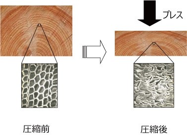そこで開発元がとったのが、木を圧縮するという方法です。木材は顕微鏡で見るとスカスカの構造になっています。これを圧縮しています。