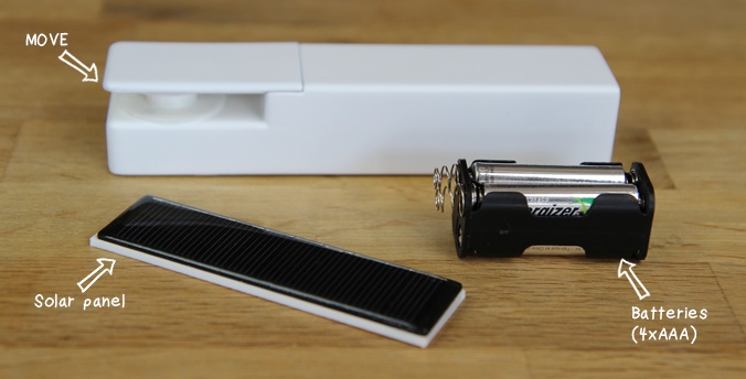 単3乾電池4本でも動きますが、充電池と付属のソーラーパネルを併用すると、自ら充電して動きます。